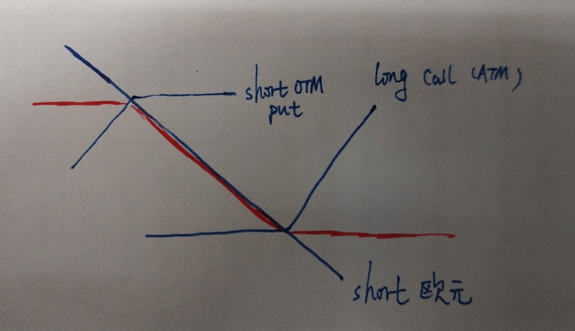 1.可以从图像1上去理解:long 日元,那么就是short 欧元,如果从欧元角度思考,short 欧元的直线斜向下的(题目背景是欧洲人投日元,担心日元下跌。但是期权标价是¥/€ options,所以从欧元角度考虑。),欧元越跌我越赚,但是short OTM put,限制了对方行权put,利润全被赚走了,所以限制了上行潜力。