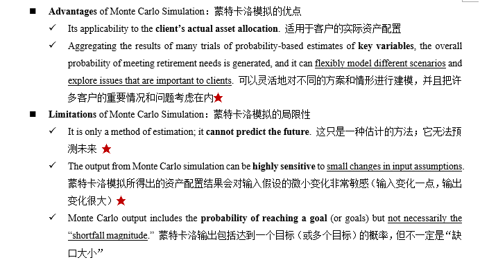 同学你好,蒙特卡洛模拟的目的是模拟出投资组合在不同期限的最终投资组合的价值分布,而不是来计算出具体的short fall的值,得不出确切值的。C选项说的是蒙特卡洛模拟能够把税收因素都考虑进去,tax consequence就是未来的税收,这样模拟出的资产配置结果会更加切合实际
