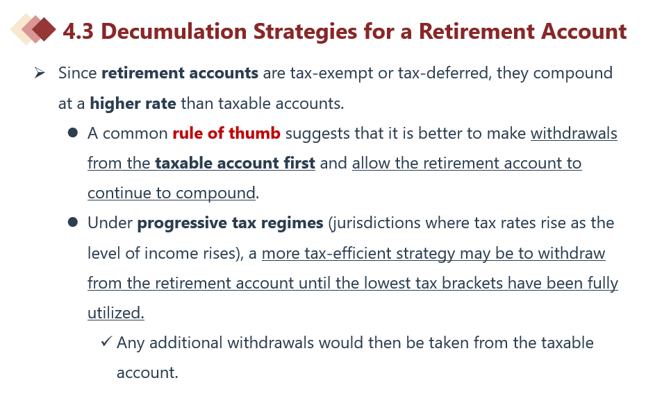 如果是progressive tax rate,那么税率就和income挂钩,一开始你两个账户共有20万,于是有20万的本金在给你产生收益,此时income高,如果从taxable account取钱的话税率也高。于是在这个高税率的情况下先从TEA取钱,毕竟它不收税,等到TEA的钱全都取完了,就只剩课税账户还在投资,本金少了一半,投资的income就少了,那时候税率也就降下去了,这个时候再从课税账户取钱