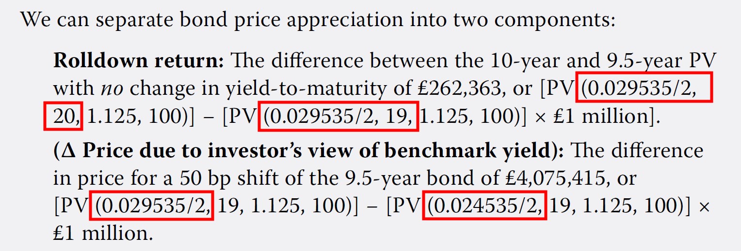 固收第三章例题4计算rolldown return 这里,对比2022年原版书有修改,改变了利率,但是结果不对。请问到底如何计算。
