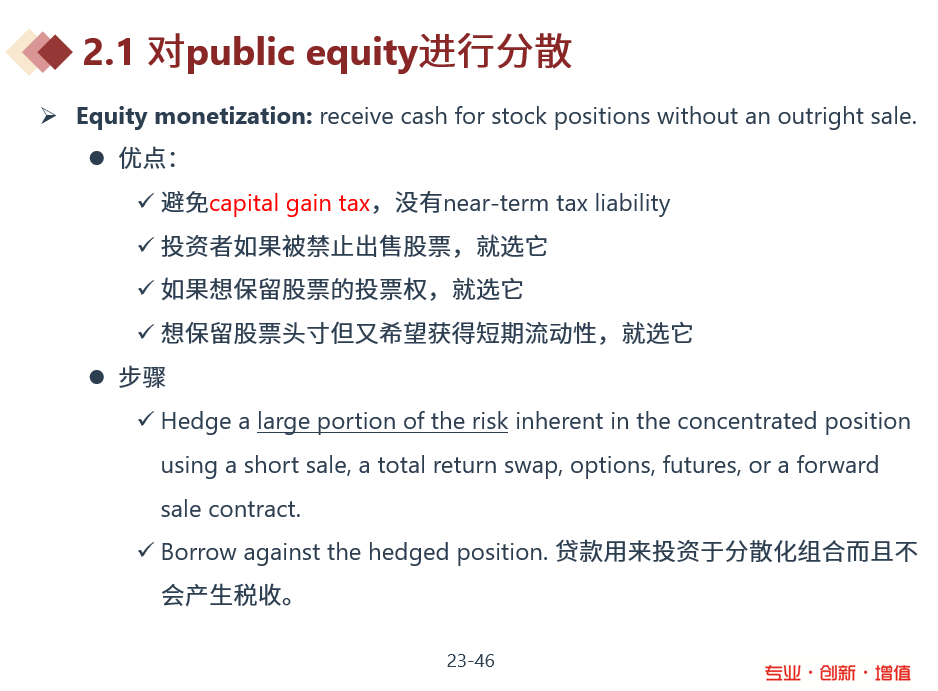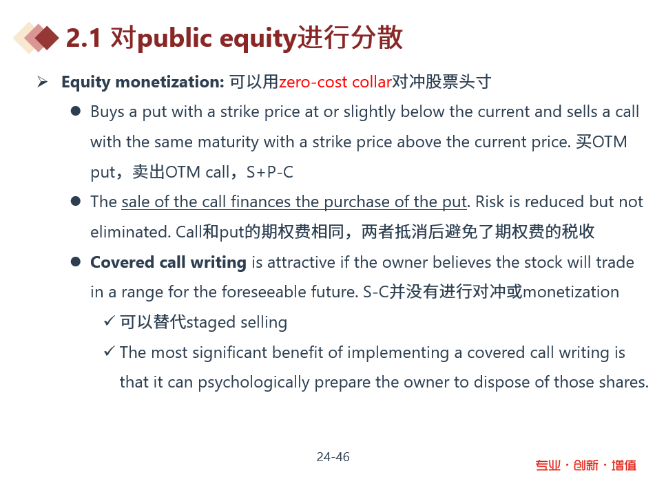 同学你好,可以参照下图,equity monetization是先对冲掉大部分股票风险后,以股票质押获取贷款,而covered call writing就是对冲股票风险的方法之一。