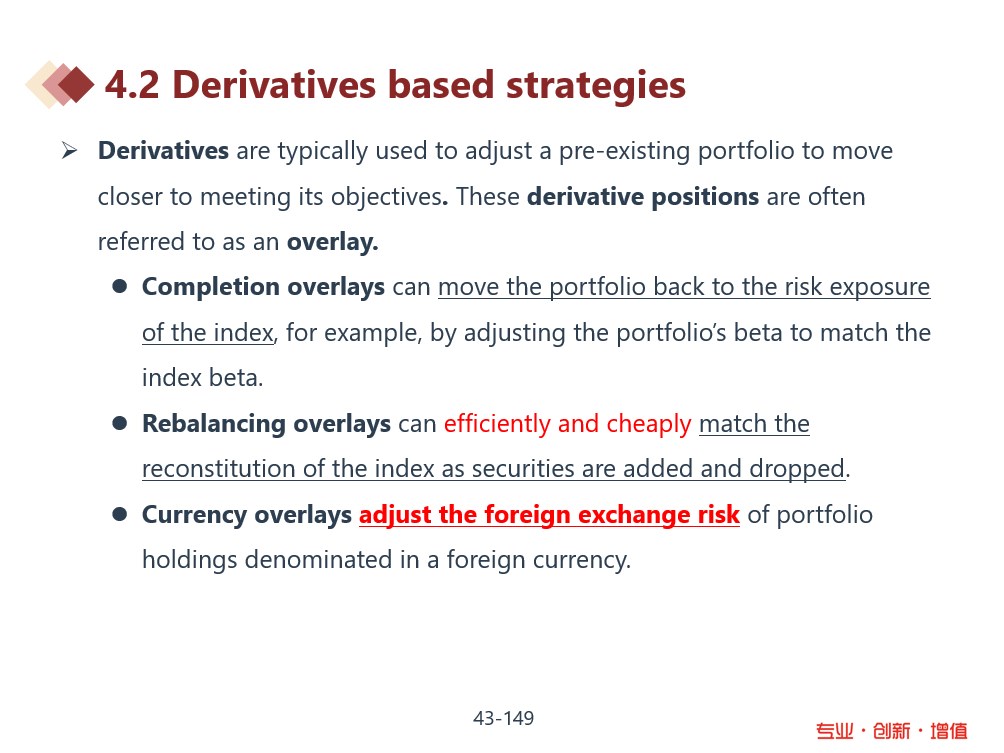 选A。此处portfolio overlay即截图中的currency overlay,是指如果股票组合中存在外币资产,可使用衍生品对冲汇率风险。