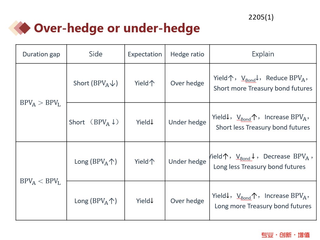 然后,为了消除duration gap,实现:BPV资产+BPV对冲=BPV负债,其中BPV对冲,其实就是购买或卖出相应的衍生产品。假设计算出需要购买或卖出的是10份futures才能消除duration gap,但是我买多了或卖多了(超过10份),那就是overhedge,如果买少了或者卖少了(少于10份),就是underhedge。