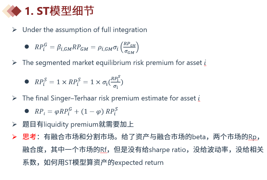 同学你好,可以参考直播时的讲解。ST model是基于对全球市场的融合与风格来计算risk premium,但公式本身并没有考虑到流动性因素,如果这个证券的流动性很差,那还需要加上illiquidity premium