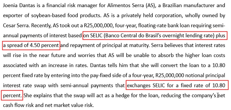 原头寸是发行了一个浮息债,支出浮动利率SELIC+4.5%,然后担心浮动利率上涨,通过一个swap,把原来的浮动利率换成固定利率。swap是支出10.8%的固定利率,收到浮动利率SELIC。