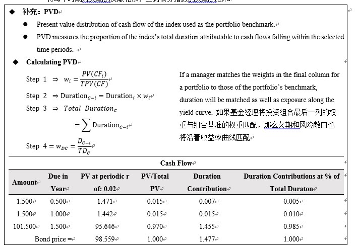 同学,上午好。PVD管理相当于KRD管理,即yield curve发生non-parallel移动时,可以用PVD或KRD管理。PVD的原理是使得index和portfolio的PVD相同,此时yield curve发生non-parallel移动时,对两者价值的影响就是相同的,也可以理解为PVD是实现KRD管理的一种方法。