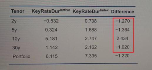 这道题可以直接比较diffierence,通过difference,active更像是long bullet,short barbell(超配中间10年,低配两端2年,5年和30年)。在bear steepen下(steepen下,bullet表现比barbell好),barbell大亏,bullet小亏,因为一long一short所以一亏一赚。
