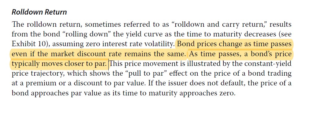 同学,上午好。这道题解析是正确的哈。然后rolldown return是假设YTM固定不变,随着时间流逝,债券价格变化。而yield curve changes是属于五因子里的E (∆Price based on investor’s view of benchmark yield)