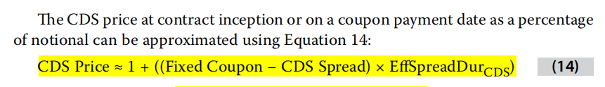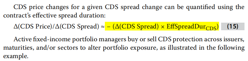 本题中的解法是根据CDS的价格计算公式计算出在CDS spread为1.75%和1.6%时分别的价格,再将两个价格相减计算出盈亏;书中也介绍了直接根据CDS spread变化计算CDS价格变化,此方法计算更为简单。