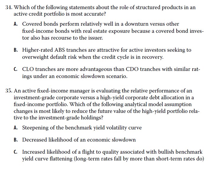 A选项,covered bond 是银行用其相关资产抵押发行的债券,即使经济下行,债券收益不好,抵押品也可以产生收益来补偿投资者,所以covered bond要比fixed income bonds好。或者我们直接可以把covered bond理解成高质量债券,经济不好,高质量债券要表现更好。所以答案是A。