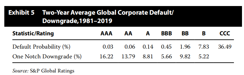 图中显示,高评级债的one notch downgrade(%)更大,低评级债的default probability(%)更大。因此投资级债,更关注spread risk,主要用spread duration衡量;投机级债,更关注 default risk,用市场价格衡量。
