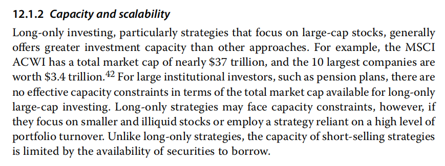 同学你好,没看到你的提问具体是哪道题。但就greater capacity 来看,单纯投资于大盘股的 long-only 策略,可以容纳的资金是比较大的。比如说short-selling 策略需要借券做空,借券的规模会受到比价大的限制。