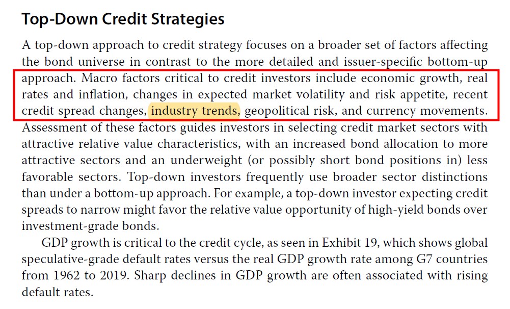 同学,上午好。从这句话“We consider overall corporate profitability, default rates, and industry trends to allocate to industry sectors and when adding an asset class, ”可以看出有top down