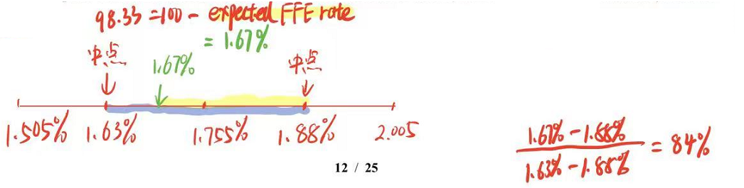 这道题的难点是为什么是1.88和1.63。之前我们在原版书遇到的example里,题目不会告诉我们现在的利率,只会告诉我们期货价格,计算一个未来利率,然后再计算概率。然后,这时候,我们就人为按25bps划分区间,比如1.5-1.75,1.75-2,然后以区间的中点,来表示当前利率。