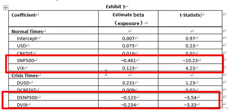 同学,上午好。是要判断t-statics与CV的大小,这张表中,红框圈出来的是可以用的。题目中问的是volatility exposure,在红框内,是可以用的。