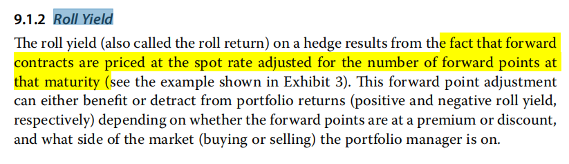 同学你好,roll yield 也叫作 roll return,在FX swap(Forward contracts have a maturity date and need to be “rolled” forward with an FX swap transaction to maintain the hedge) 、Trading the forward rate bias等多个地方出现,roll yield 是用F-S计算。