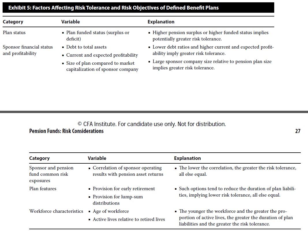 同学你好,关于影响养老金的risk tolerance的因素都总结在下表中了,可以看出答案所给的两个点都是体现在下面的表格中。你说的这个点不是流动性需求很高的体现,而是他的投资目的,他希望每年的contribution能够小于每年所增加的福利支出,也就是希望自己能少掏一些钱,缺口部分由投资组合的收益来补上,这个缺口越大,对投资组合的收益率要求就越高,缺口小的话收益率要求也就可以小一些。