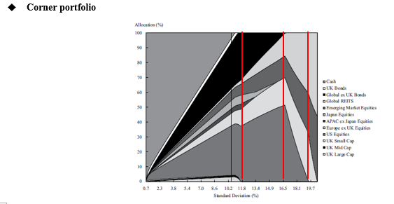 同学你好,可以参考冲刺笔记的总结。下图是有效前沿(efficient frontier),其中使得各资产配置的斜率发生拐折的投资组合(如红线位置)就是corner portfolio。因此corner portfolio都位于有效前沿上,两个corner portfolio之间的线性组合所构成的新组合也是有效组合。