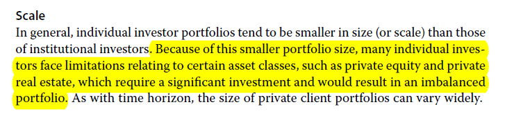 最后一题,将alternative投资有什么问题时,没明白这个scale怎么理解,为何不合适。-- Scale: In general, personal investors tend to have smaller portfolios, which can result in a concentrated asset class, leaving an imbalanced portfolio.