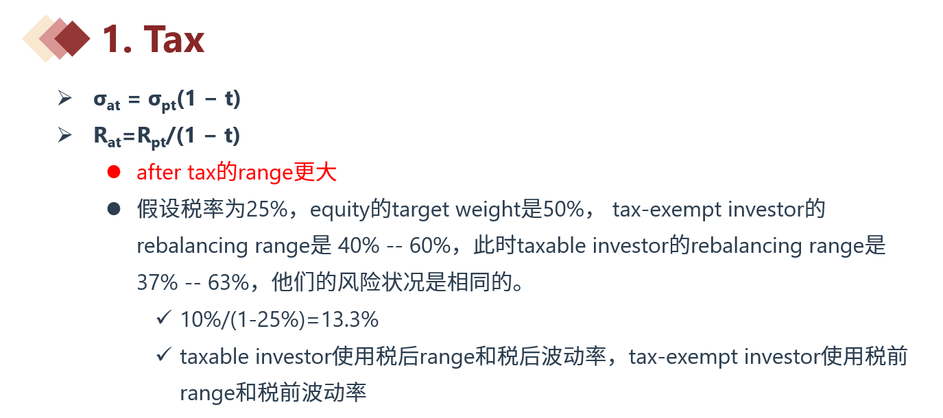 5.5M的账户是税后的,税后的rebalancing range会大于税前,那采用rebalancing range更高的alternative 2会更适合。3M的账户是tax-deferred,那么它的rebalancing range就未被税收影响,会更加窄一些,于是采用alternative 1更为合适。可以发现alternative 1的rebalance range是8%,将他除以(1-25%)后得出的就是alternative 2的rebalance range10.7%,因此alternative 1适用于税前账户,alternative 2适合税后账户。