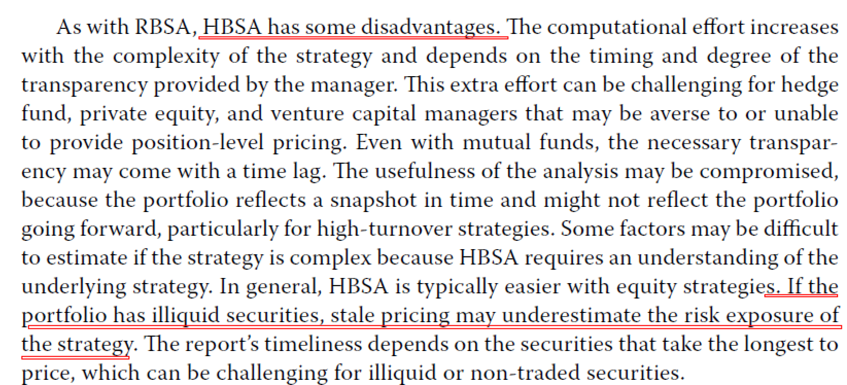 如果组合中有流动性较差的资产,那么stale pricing会同时影响RBSA和HBSA。RBSA因为是通过收益率回归来判定风格的,因此肯定会受stale pricing的影响。而HBSA是根据当前持仓的属性来判断风格的,那么也会需要资产价格等市场数据,而流动性较差的资产可能没有活跃的市场价格数据,也会影响HBSA的结果。