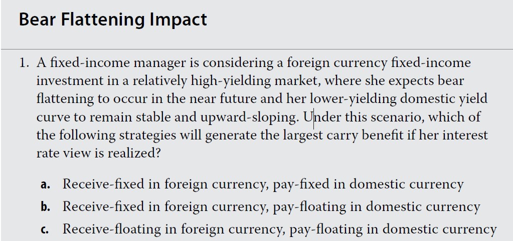 1. 国外利率高,且会上涨flatten,所以投资国外利率(receive floating);国内利率低,且稳定,所以借国内利率(pay)