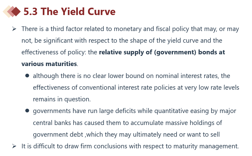 同学你好,可以参照讲义,政府需要发哪个期限的国债,央行在实施量化宽松时会买卖哪种期限的国债,这些都是不确定的,这最终也会导致财政政策对yield curve影响的不确定性。