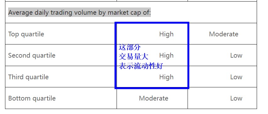 1. 大盘股的流动性往往会更好。另外流动性好,那么每天成交量会很大,这个也可以从Average daily trading volume 看出的