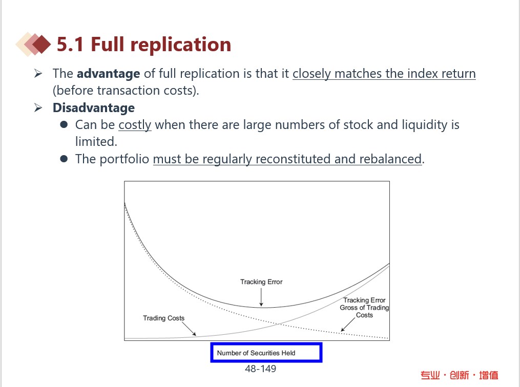 client持有股数多,TE小的结论见截图。在full replication,随着持股数量的增加(都是index里的股票),tracking error会下降,然后再随着持股数的增加,tracking error会增加。