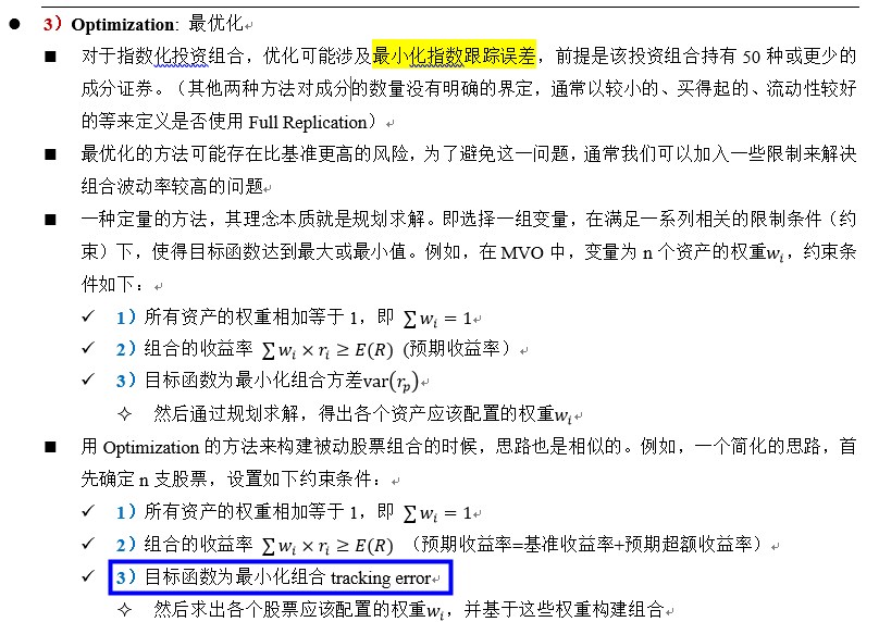 同学,上午好。optimization是会事先设置好限制,要求组合的tracking error最小,然后让计算器给出能达到最小tracking error时的组合权重。