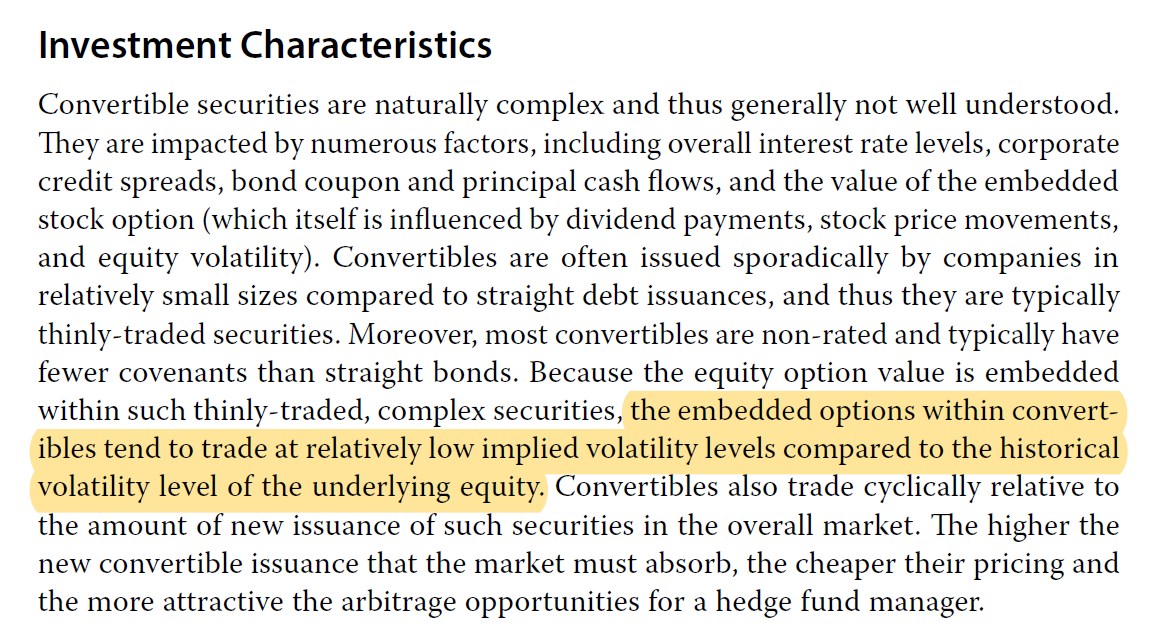 同学,上午好。可转债套利,背后的逻辑是可转债中的option被低估,这个可以当结论记忆。(截图1),可转债里的option implied volatility被低估,所以option定价被低估。选A。
