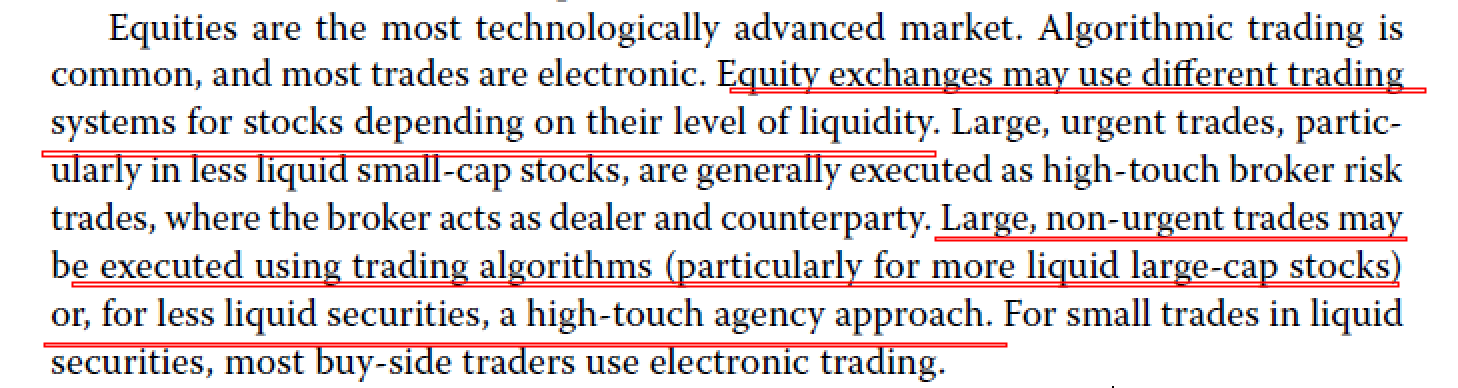 大规模的非紧急交易通常使用high-touch(人工互动)的方法来实现(agency trade而非principal trade)。