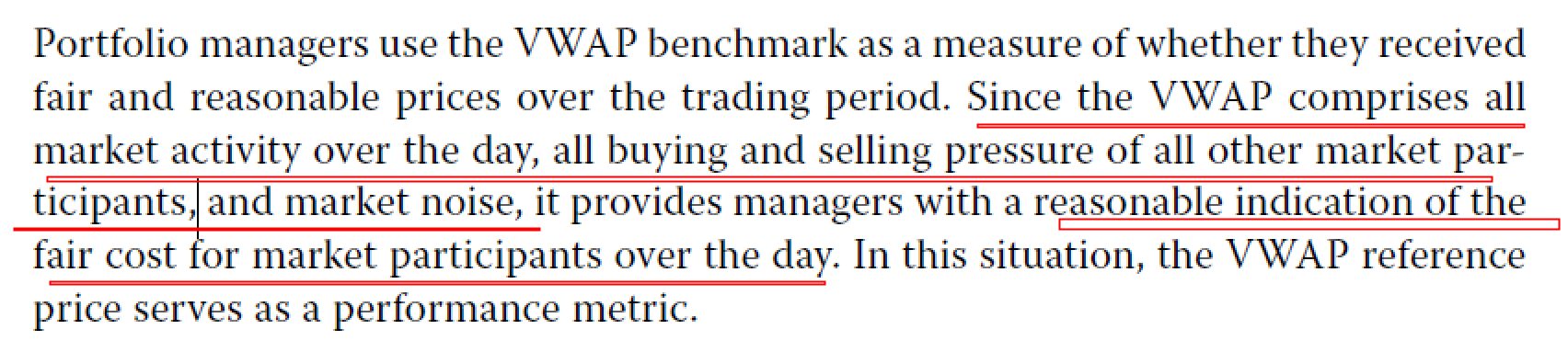 原版书上说的是,因为VWAP它可以反映一天中所有的价格波动,如果市场在不同实践期间,价格和交易量波动很大的话,用VWAP更能反映如果交易者全天参与市场所产生的fair cost。