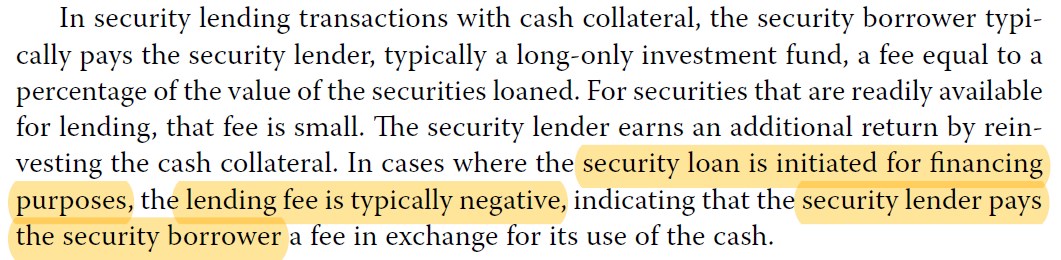 如果是negative lending fee,那么,可以这样理解,A手里有股票,但A缺钱用,所以A把股票借给B,换B的现金抵押物,那么这就相当于A把股票抵押给B,换现金的使用,那么A需要支付B一笔费用(A向B借钱)。