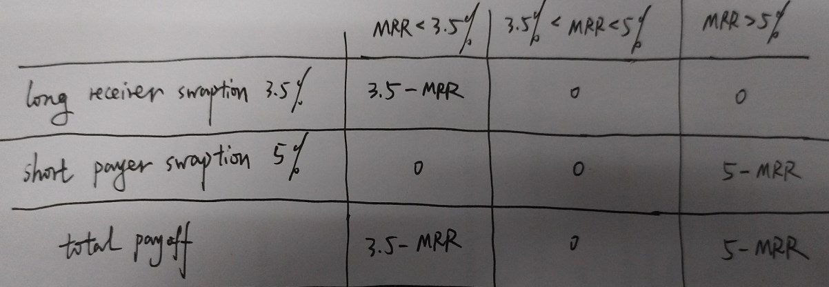 同时,进入期权会付出期权费,我想要降低期权费,因此会short payer swaption(对方能支固定strike rate=5%,收浮动),利率上涨时可能会面临损失。整体图形举例见截图(long 3.5% receiver swaption,short 5% payer swaption);