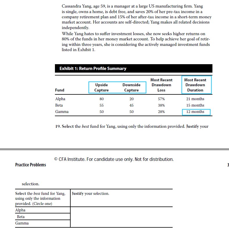 Yang预计3年内退休,题目想用这个条件来限制投资回撤的时间drawdown duration,而Gamma有最短的时间“12个月”,于是Gamma最合适