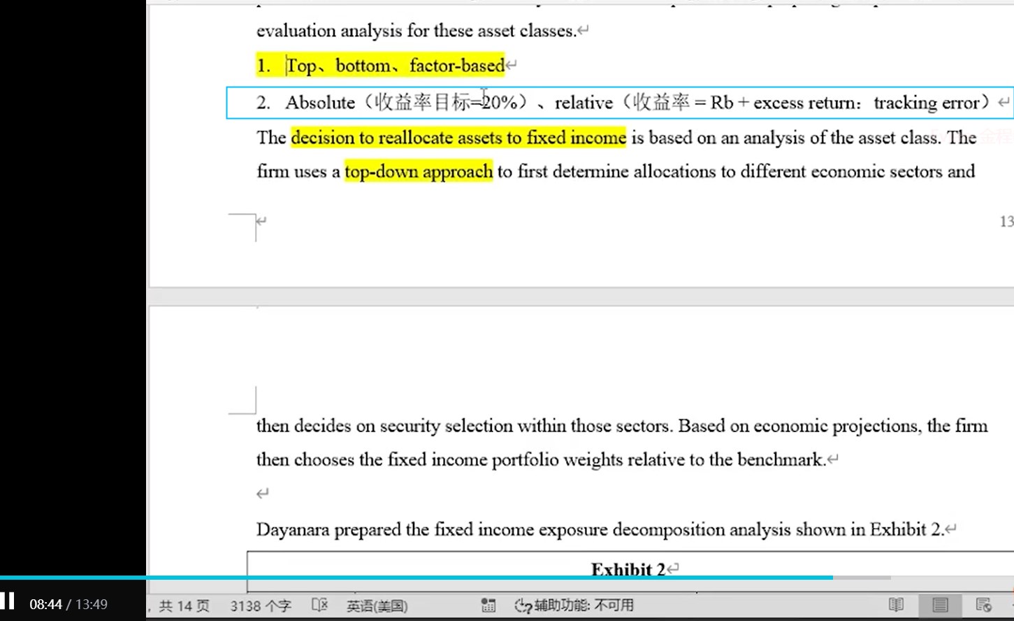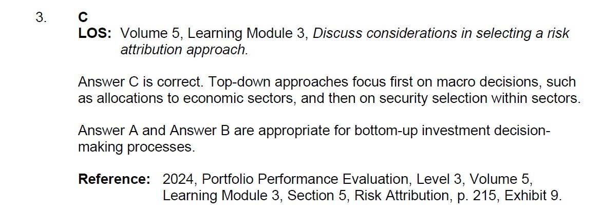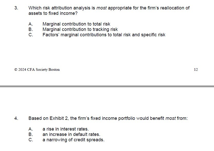 原版苏的例题,它如果是相对,表述是针对“收益”或者“风险”,而不是权重,这个Case Q3有点怪怪的,题干想表达相对(Based on economic projections, the firm then chooses the fixed income portfolio weights relative to the benchmark.),但是Q3的选项A和B都排除了(根据top-down),只能选C,而C是绝对,就很怪