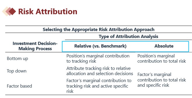 请参考以下截图,risk attribution中绝对和相对的概念,是针对“收益率”相对于benchmark的区分,而不是权重
