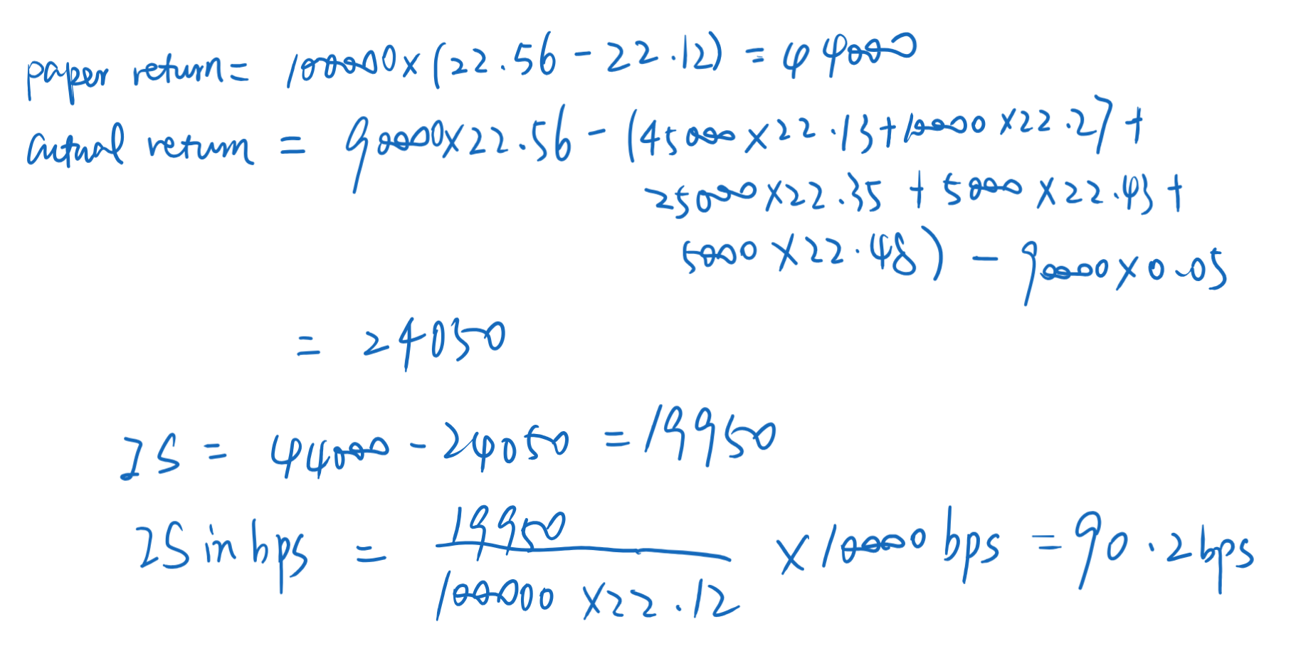 老师第三题,如果用paper return - actual return应该怎么算?我用的这个方法算的,答案对不上。