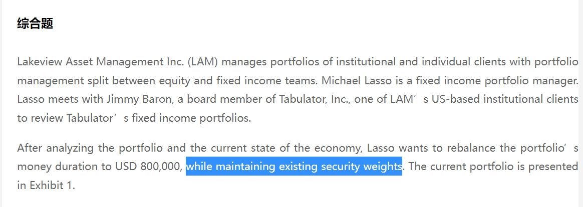 请参考以下截图,题目说了:while maintaining existing security weights,那么投资组合中每个资产的权重都是不变的,于是投资组合的增长与money duration的增长是一致的,于是解析计算过程才可以用money duration的变动去乘以投资组合的价值,计算得出需要变动的美元金额