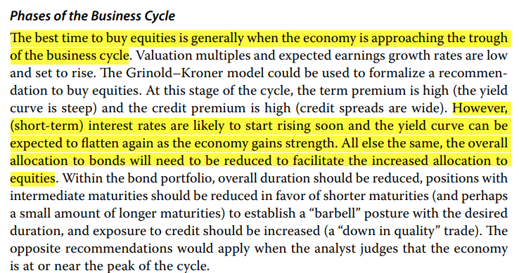 同学你好,目前已经处于经济底部了,意味着之后经济就要触底反弹了,短期利率也会预期要上升,yield curve会预计变平坦,债券价格也会下降