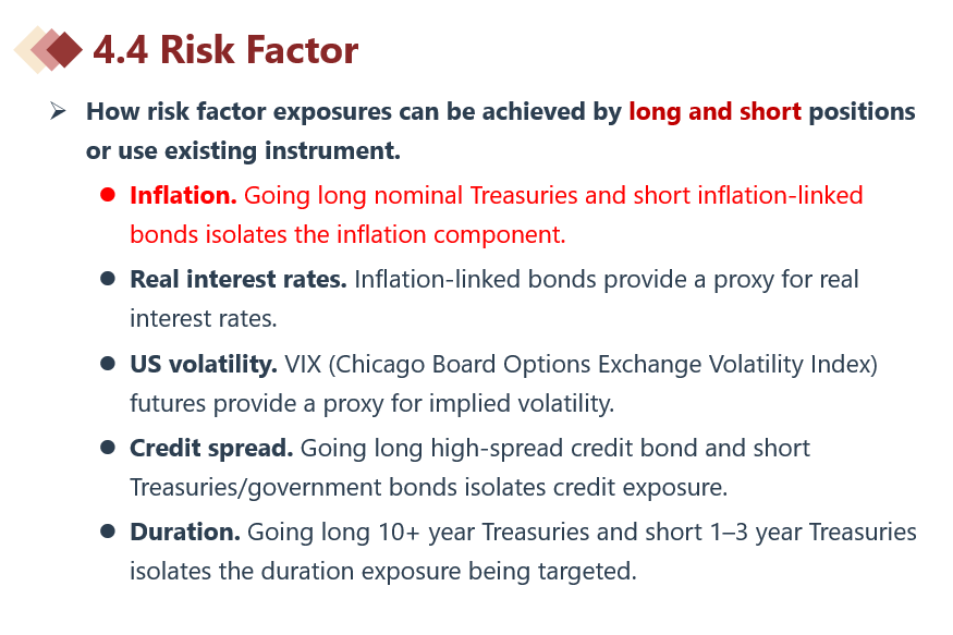 同学你好,知识点截图分别如下。风险因子只会对不可分散的系统风险提供风险溢价,那些能够被分散的非系统性风险不会有额外收益。通胀因子是做多一个名义债券,做空一个通胀债券所得到的。