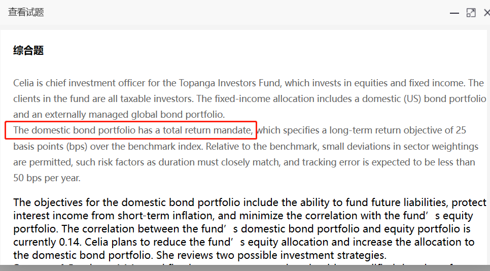 老师好,因为案例中The domestic bond portfolio has a total return mandate, total return mandate有这个描述,所以策略1和策略2均不涉及funding future liability吗?