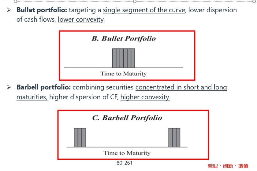 在久期一样的情况下,bullet的现金流集中在中间,ladder的现金流平均分散,barbell现金流一头一尾在两端。