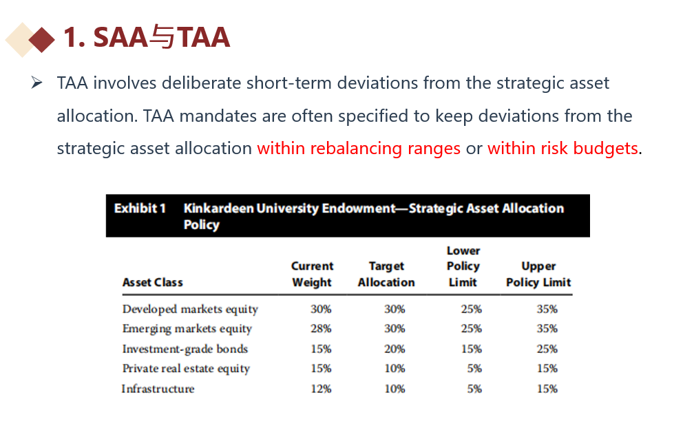 同学你好,IPS会写明投资者的各种风险限制以及风险承受能力和收益目标,能符合投资者收益要求并且满足各个条件限制的长期资产配置叫SAA,也叫policy portfolio,SAA的return也叫policy return。所以SAA是一个投资组合,而不是一个资产权重的范围。可允许浮动的资产权重范围叫rebalancing range,资产权重上限就是upper limit,下限就是lower limit,而TAA就是偏离于SAA进行投资,但是不可以超出range的范围。哪怕修改了mandate,IPS发生了变动,有了新的SAA和rebalancing range,那么TAA还是只能在新的range范围内进行调整。