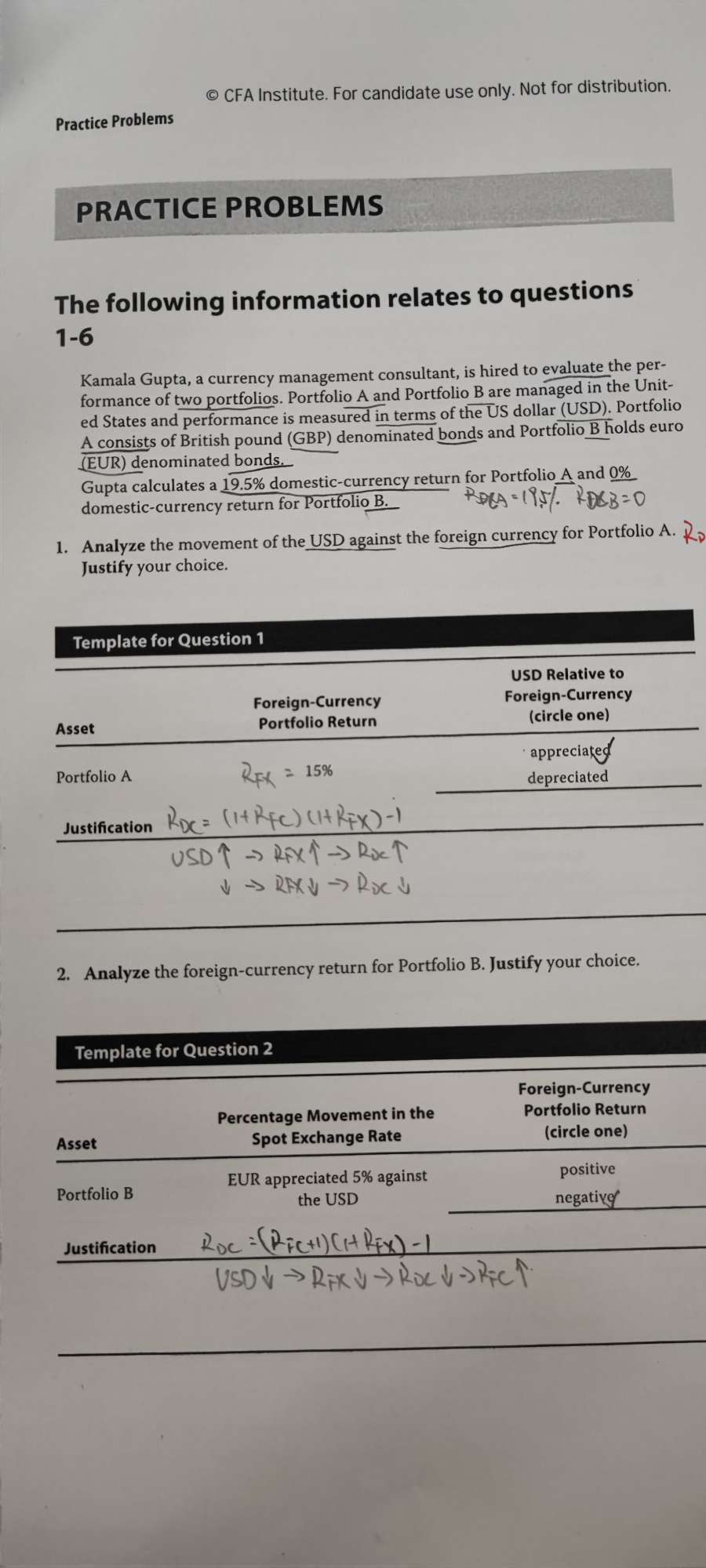 此题逻辑,对于portfolio A,美元是本币(题干条件Portfolio A and Portfolio B are managed in the United States and performance is measured in terms of the US dollar),而投资GBP国债。所以GBP是外币,USD是本币。