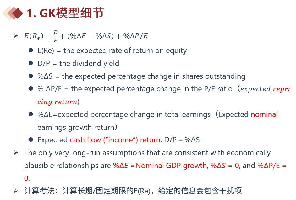 同学你好,可以参考下图总结。在长期,GK model他会假设%ΔE =Nominal GDP growth, 那也是就会说%ΔS = 0, %ΔP/E = 0,他们都是0
