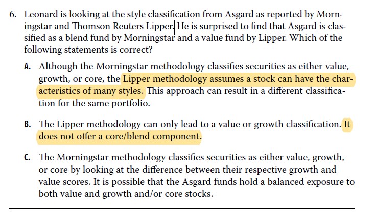 同学,上午好。知识点比较偏,见截图。以及A和B的错误处已经标黄了。B错在Thomson Reuters Lipper也有blended的。