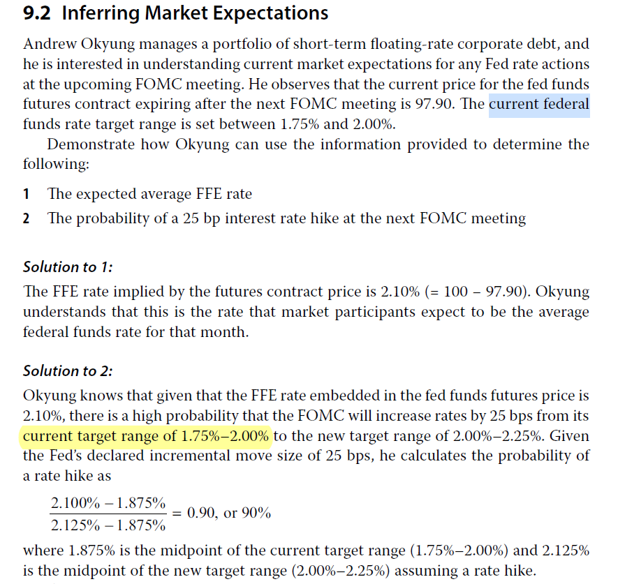 之前我们遇到的example里,题目不会告诉我们现在的利率,只会告诉我们期货价格,计算一个未来利率,然后再计算概率。然后,这时候,我们就人为按25bps划分区间,比如1.5-1.75,1.75-2,然后以区间的中点,来表示当前利率。那么,就是1.625和1.875。比如我截图的这道case,他没告诉我们当前利率,那么就用区间中点。