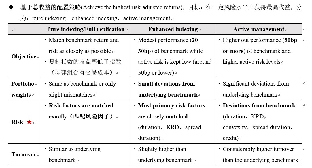 而enhanced要求duration closely match(主要是duration,KRD,spread duration),其他随意。所以可以看到表格里,portfolio 3,KRD这里还是匹配的,但是在credit和country exposure偏离就有些大了。